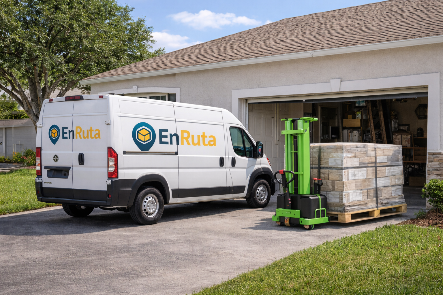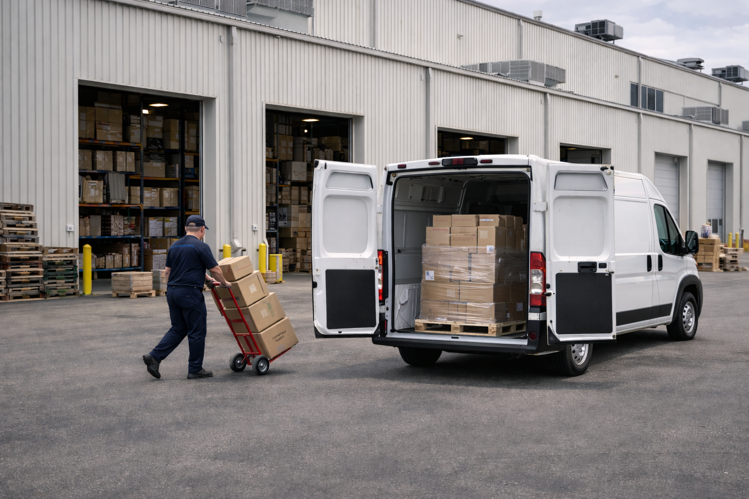 Pallet delivery to job sites, commercial, and residential locations. Big trucks are slow, expensive, and built for loading docks. Our cargo vans deliver pallets faster to locations without docks, with self-loading ground-level handling up to 50".